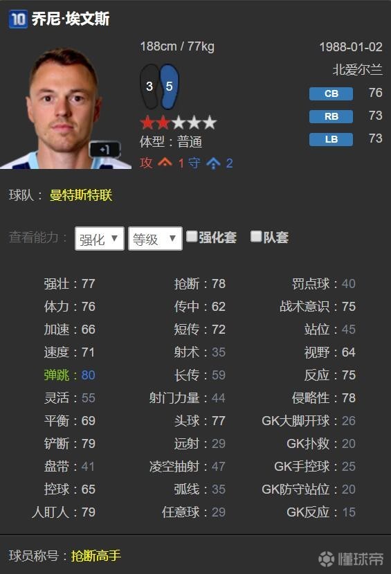 北爱尔兰足球运动员,司职中后卫,有时也可以客串左后卫的位置,弗格森时代的宠儿之一,爵爷曾因为力推埃文斯卖走了当时技术特点相似的皮看穿。游戏里唯一能用的就是10U,银卡满级防守属性还算客观。