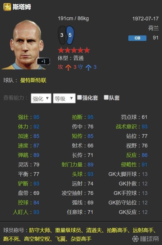 传奇斯塔姆与马尔蒂尼手感不分上下,是很多玩家的第一中卫选择,作为后卫神一般的双速,其他数据也无可挑剔,参与度3-3,随便调可进可退,角球进攻时经常能杀到对方禁区里暴力头球得分,第一CB趋近于完美。