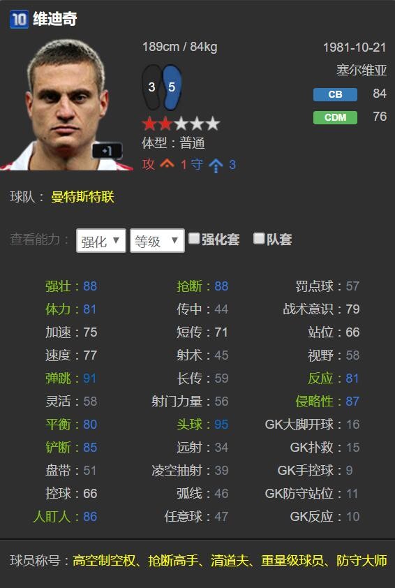 10U维迪奇拥有完美的模型,各个阶层的玩家都必备的一张卡。红魔曾经的老队长75-77的双速,模型相当完美。无论对方的前锋是谁,只要自己不出现操作上致命的失误,后防一定稳如泰山。进攻时他的头球也经常给我们带来惊喜。