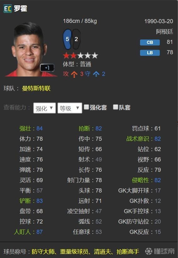 16EC罗霍在中卫位置上很灵活,属于哪里缺人他就可以补到哪里的积极型中卫,1米86的身高在中卫位置上有些不足。