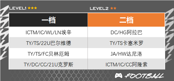 皇马套的中场可分为扫荡型后腰埃辛、阿拉巴、达尼洛),全能型中场贝林厄姆、巴尔维德),组织型中场克罗斯、阿隆索)三大类,其中登场率最高的依然是埃辛和贝林厄姆,两位球员都有着不错的模型和身体素质,前者的覆盖面积与后者的推进远射能力也能形成互补。
