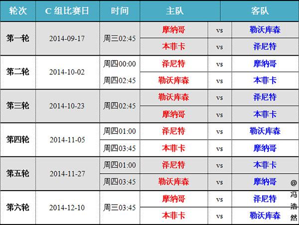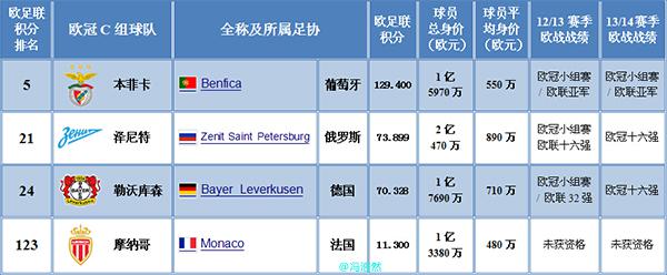 预测C组排名:1、勒沃库森;2、泽尼特;3、本菲卡;4、摩纳哥