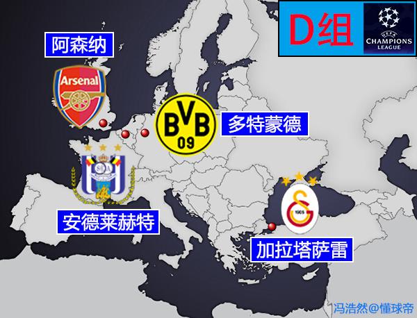 D组由英超阿森纳、德甲多特蒙德、土超加拉塔萨雷和比甲安德莱赫特四队组成。从地理位置看,西欧、中欧三队非常邻近,加拉塔萨雷名声不佳的“地狱主场”将是对他们的共同考验。而多特蒙德的威斯特法伦球场同样有着魔鬼主场之名,对于其他三家球会而言,客场奔赴多特蒙德也是凶险之旅。