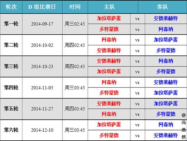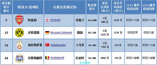 预测D组排名:1、多特蒙德;2、阿森纳;3、加拉塔萨雷;4、安德莱赫特