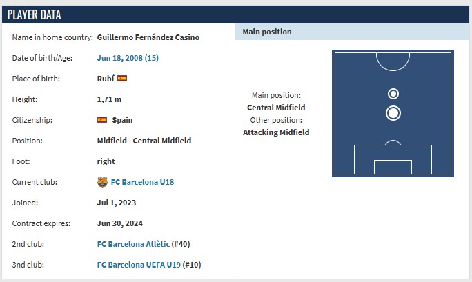 吉耶·费尔南德斯(Guille Fernandez),2008年6月18日生于西班牙巴塞罗那西北部的小城鲁维,现效力于西协甲巴塞罗那U19/巴塞罗那竞技(巴萨B队)。作为拉玛西亚自己培养的本地血脉,还未达到西甲参赛年龄的吉耶已经得到了各方媒体的高度赞誉,是巴萨这一批青训的明珠之一。