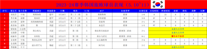 附:韩国球员旅欧表现(5.10~11)