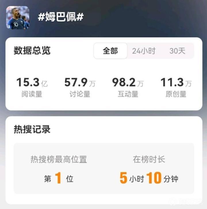 受关注,姆巴佩加盟皇马后,词条“姆巴佩”一度登顶微博热搜榜