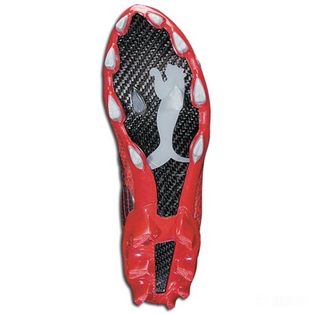 接下来就到了当年Puma足球鞋的“良心”大底部分!和现在Puma比较强悍的超长鞋钉不同,十年前的Puma V1.06足球鞋的鞋底是非常适合人草的。具体为粗壮且分布密集的三角钉设计,数量为惊人的16颗,并且鞋钉长度都为1厘米左右,可以很好的适应中等人草。还值得注意的是,中间所谓的启动加速钉被增加到了两颗,长度却更短,非常适合实战的一种设计。与此同时,Puma V1.06在当时也创新性的使用了碳纤维材料,也就是一直被人津津乐道的“碳纤维”大底。其大底的韧性和轻质功力相比普通版本,得到了更加显著的提升,在保证人草兼容性的情况下,体现出出众的抓地力和加速启动功能,无愧为速度系大底!