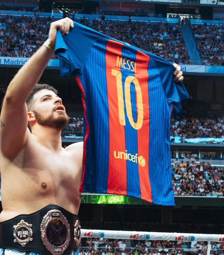 阿根廷主播La Cobra在伯纳乌参加了一场网红拳击赛,并在最后获得了本场比赛的金腰带。在台上,他手举梅西的10号巴萨球衣向看台进行了环绕展示。此后,La Cobra在社交媒体发文记录这一刻,巴萨官方和曼联球星加纳乔进行了评论。