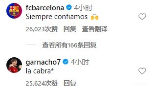 赛后,La Cobra在社交媒体发文记录了这一时刻,巴萨官方和加纳乔在帖子下方进行了留言。