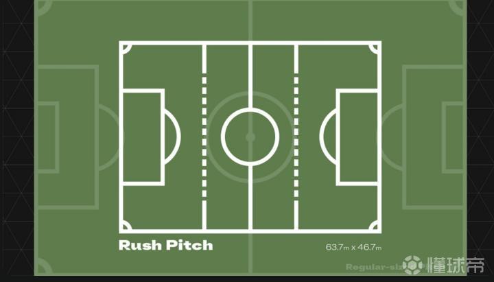 场地的尺寸约为63.7米 x 46.6米,约为传统 11v11 足球场地面积的41.5%。这种更小的、更“方”的场地形状旨在鼓励横向传球,并保持足够的宽度,以防止场地感觉过于狭窄。