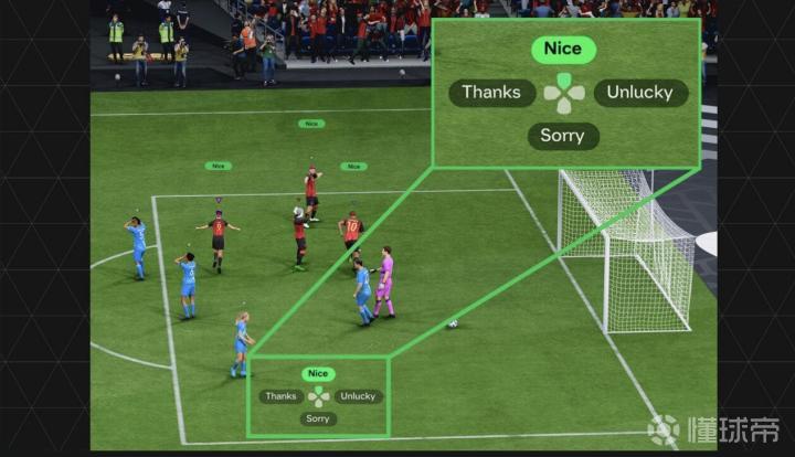 球员在不持球时也可以向队友请求动作。他们可以使用对应这些动作的按钮发送如“传球”、“传中”、“直塞”或“射门”的指令。消息如“跑动”、“接应”或“逼抢”也可以通过相应的按钮发送。AI队友也会尝试响应这些请求。快速聊天和战术请求的总体目标是为球员提供更多的社交选项,同时也让他们对AI队友有更多的控制。