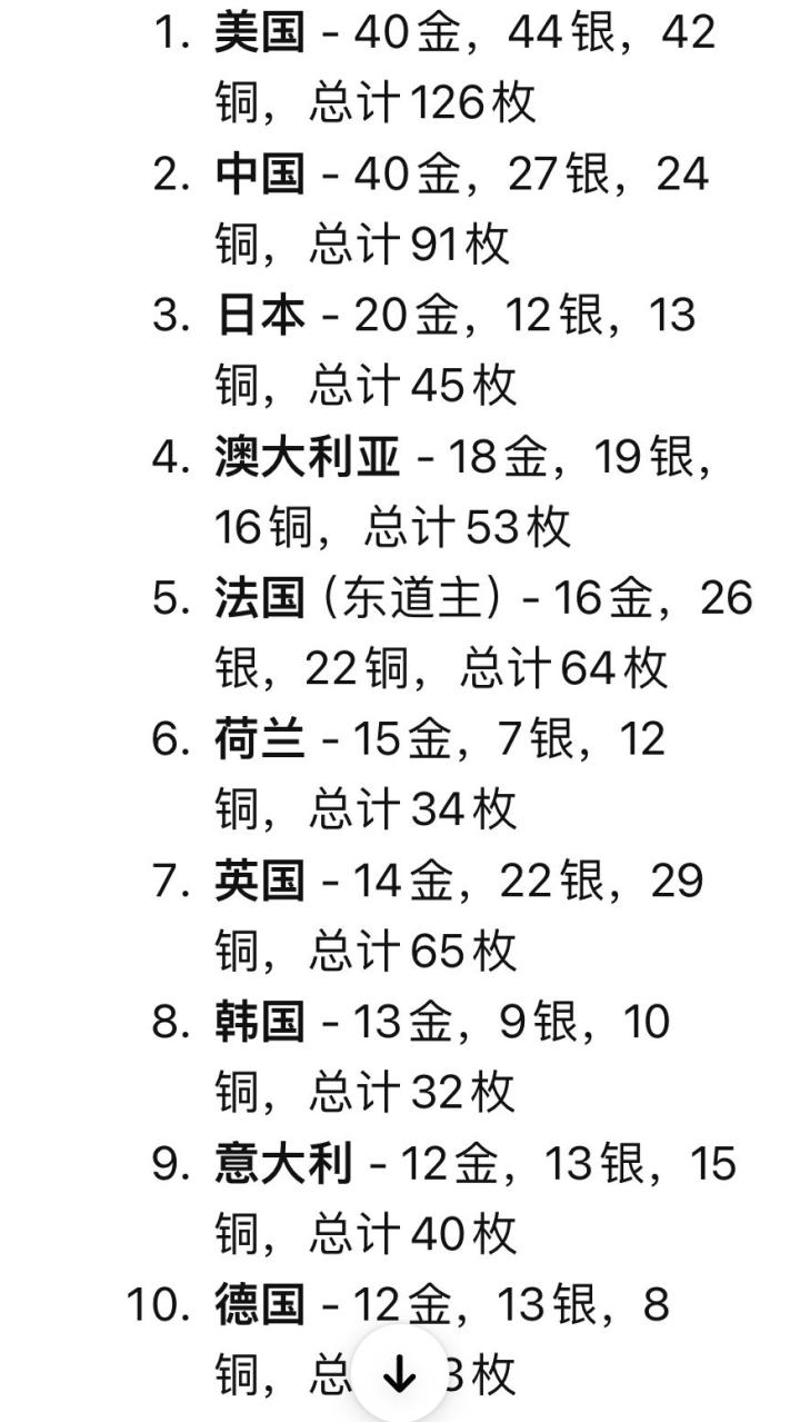 2024巴黎奥运会金牌榜前十名,G7中仅加拿大未进入前十,金牌基本反映了综合国力。中国、澳大利亚、荷兰和韩国的发挥比较优异,英国的金牌前几届比有所下降,但奖牌数是第三,仅次于中美,相当厉害了,他们拥有多个夺金点的自行车队表现一般,可能是因为总监布雷斯福德爵士来曼联了。 冷战期间东德和西德在金牌榜上都很生猛,统一后反倒降温了,但德国依然是世界上公认的体育强国。