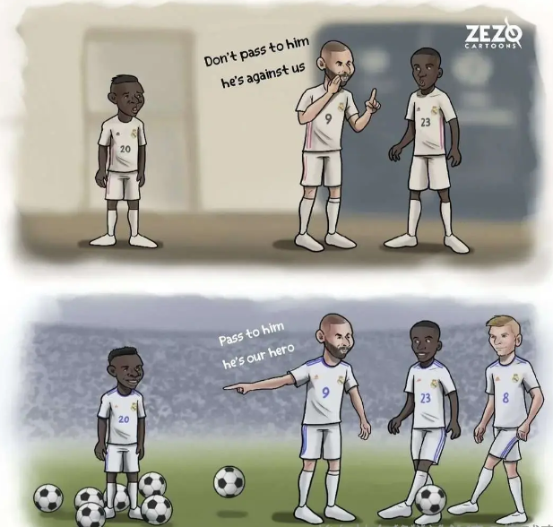 刘强专栏艰难击败斯图加特,皇马开启了欧冠卫冕之旅。这场比赛的焦点人物是姆巴佩、库尔图瓦和卡瓦哈尔,上赛季欧冠最佳球员维尼修斯隐居幕后。当然,现在可能也没多少人在意他在场上的表现,“流量”都在他的言论和争议手势上,这就是维尼修斯如今的处境。当绿茵明星变成了社会人物,维尼修斯似乎还没有做好适应新角色的准备,成长的阵痛虽迟但到,这位年少成名的球星正陷入前所未有的危机之中。