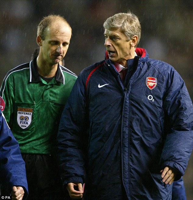 (图)在0-2不敌曼联,终结了不败神话后,温格向主裁判麦克莱利表达着自己的不满。