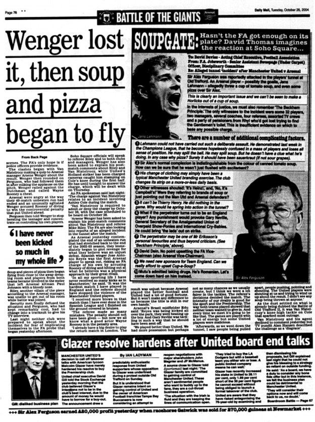 曼联终结枪手不败记录,赛后弗格森爵士被阿森纳球员投掷的食物和汤击中。