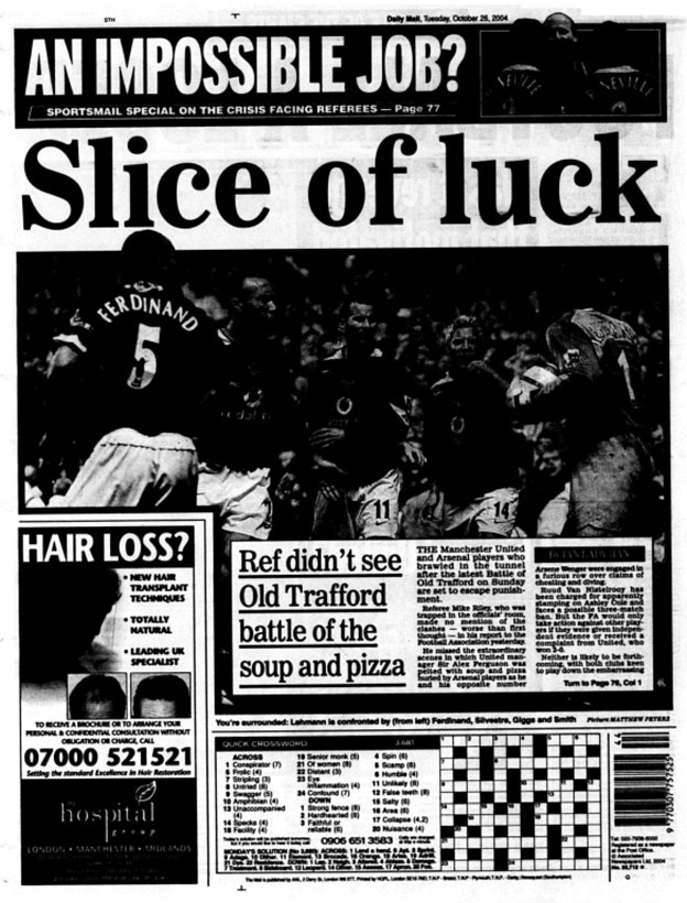 在发生了球员通道的冲突之后,弗格森被迫换了一件新衬衫去进行电视采访。那个由阿森纳球员投来的食物已经被曼联放在了他们的更衣室里。