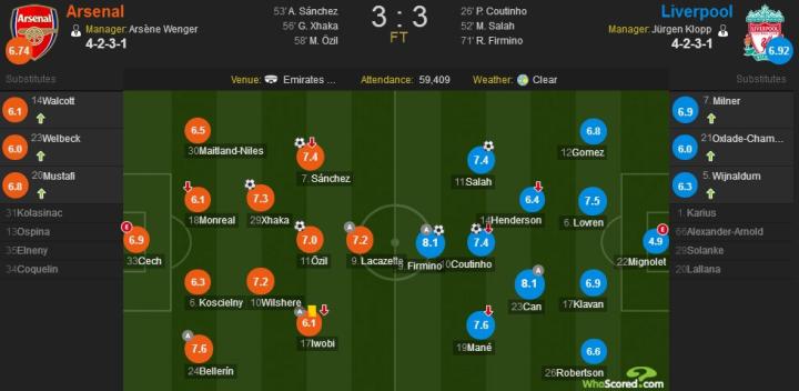 阿森纳方面,送出一次助攻的贝莱林获得了全队最高的7.6分;利物浦方面,奉献一次助攻的埃姆雷-詹和传射建功的菲尔米诺并列获得全场最高的8.1分!