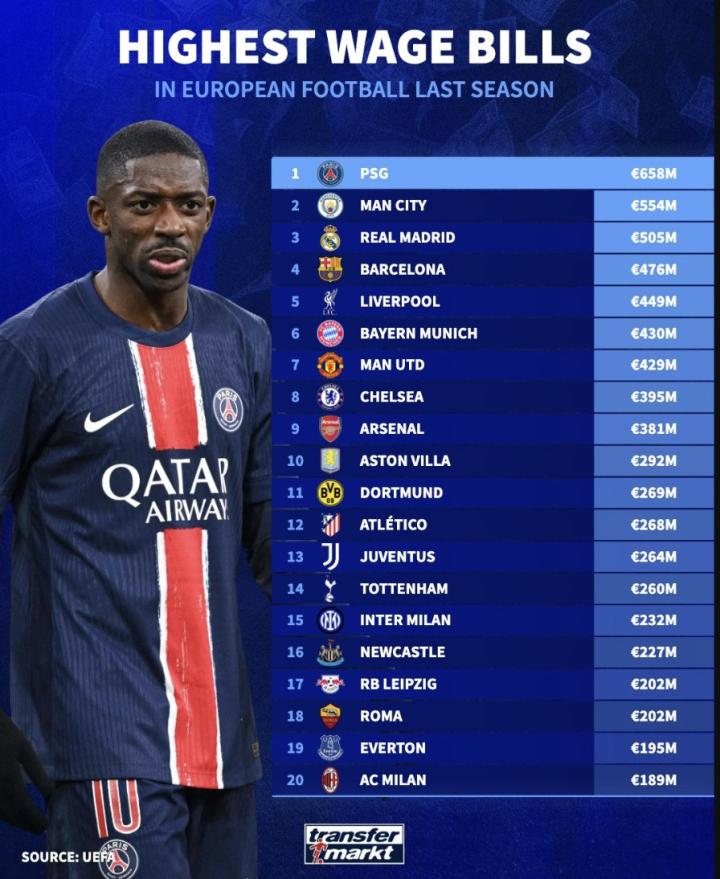德转列欧洲球队薪资榜单:巴黎6.58亿欧居首,曼城、皇马前三