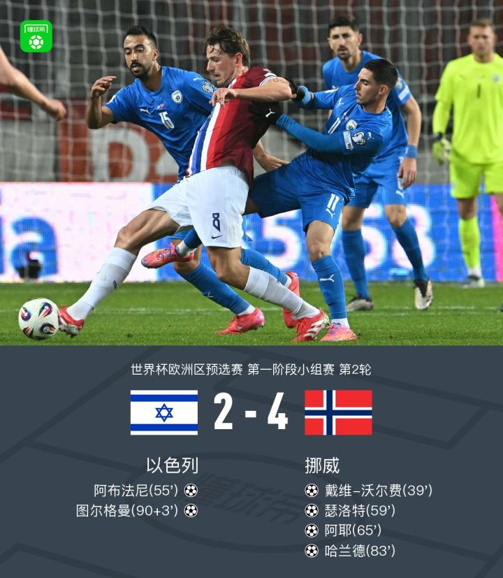 世界杯欧洲区预选赛第一阶段小组赛第2轮,以色列与挪威展开较量。比赛中,挪威由戴维-沃尔费率先建功,随后瑟洛特与阿耶接连得分,进一步扩大领先优势。哈兰德在比赛后半段锦上添花,帮助挪威稳固胜局。以色列方面,阿布法尼打入一球为球队追回一分,图尔格曼在比赛尾声阶段再入一球,但未能改变最终结果。全场比赛结束,以色列2-4不敌挪威。