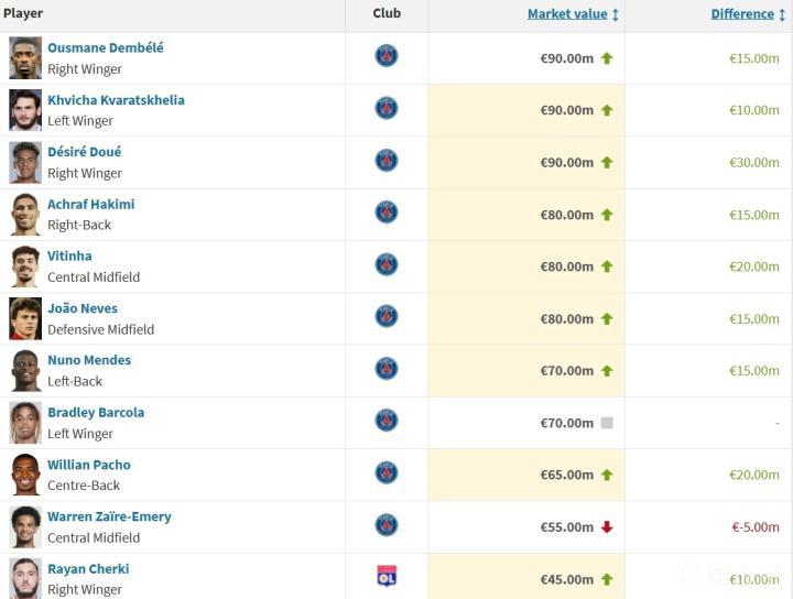 德转更新法甲身价:大巴黎包揽前十,杜埃上升3000万并列第一