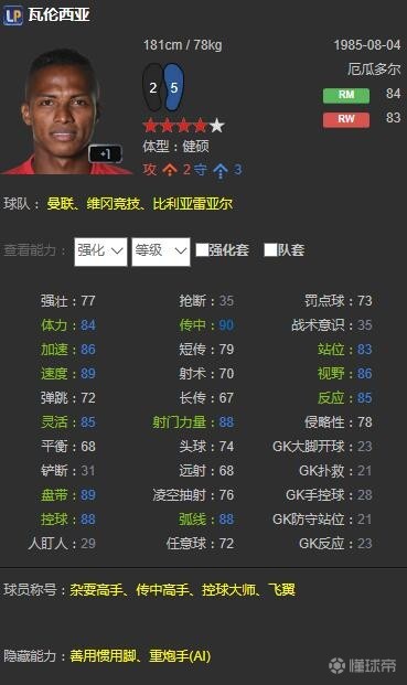 在红魔效力多年的瓦伦西亚已经从边锋改到了边后卫,但不变的是他对曼联的热爱与忠诚,LP瓦伦西亚绝对是曼联套玩家必入的一张卡,单卡能力84,高强后非常好用。