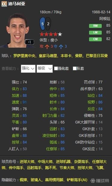 CC迪玛利亚是曼联套内唯一可以使用的迪玛利亚,拥有多个户口,总评85,可以作为吉格斯的替补使用。