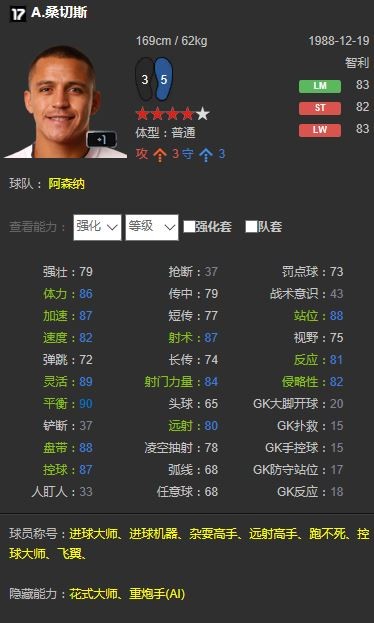 17赛季桑切斯,虽然目前还是阿森纳户口,但是相信韩服不久后就会将其更新为曼联户口,总评为83,曼联球迷准备好入手你们的新7号了吗?