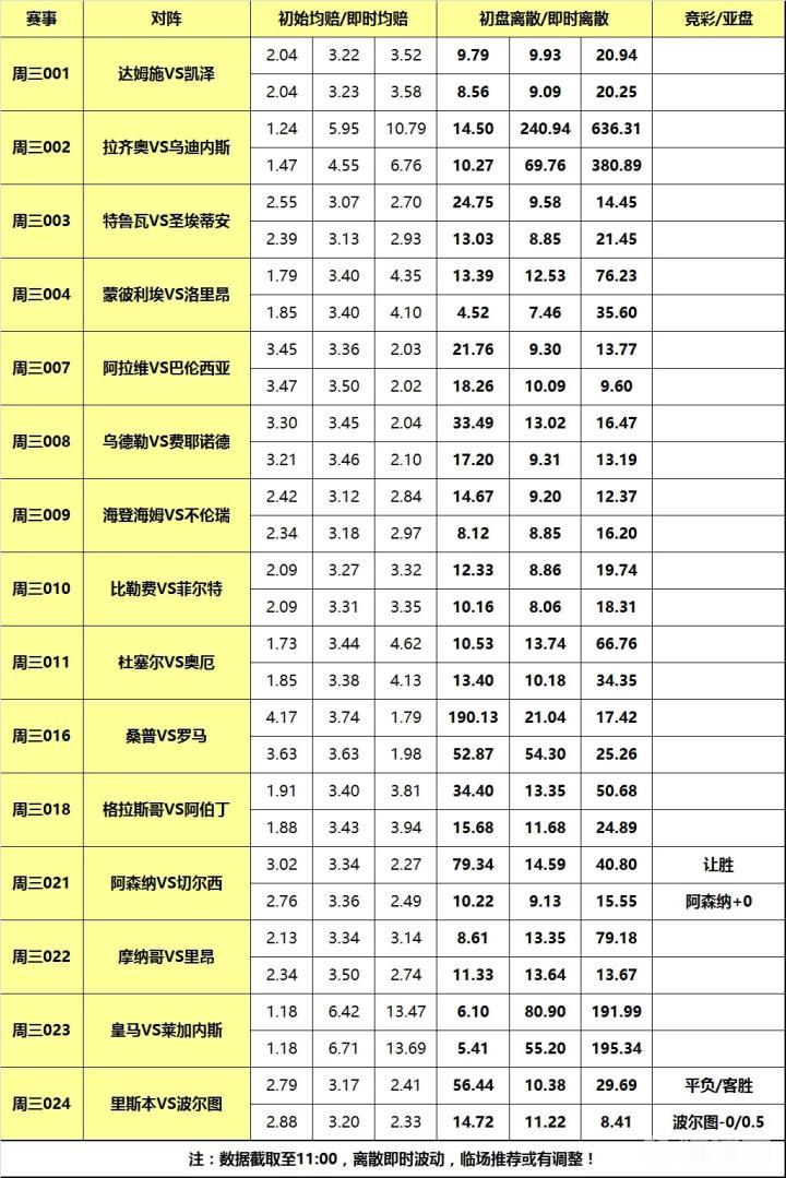 [关于离散] 是竞技彩票特有分析指数,指数基于百家欧赔即时赔率分歧度。基本原理是:百家欧赔平均值与每家赔率差值的绝对值的求和。离散度小则赔率公司观点接近,进而 彩果易打出,离散度大则反之意见分歧大,彩果不易打出。又因庄家操盘/变赔影响,离散低则概率高理论并非放之四海而皆准,需结合盘赔和基本面等信息综合运 用。简言之,离散是参考指标,而非填单依据!以下是各场数据汇总(数据截取至11:00):