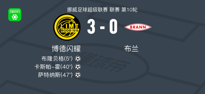 博德闪耀3-0布兰,布隆贝格、卡斯帕-霍破门,萨特纳斯建功