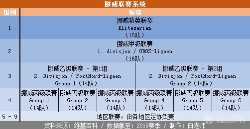 挪威联赛系统最高的四个级别可以简单概括为1-1-2-6。挪威精英联赛和挪甲分别都是一个联赛,挪乙分为两组,挪丙则再分为六组。第五级别至第九级别都是地区联赛,地区联赛基本是以挪威的郡为单位,由每个郡的足协负责运营。因为挪丙会有降级球队,所以地区联赛最高级别的球队会有机会升级至挪丙。