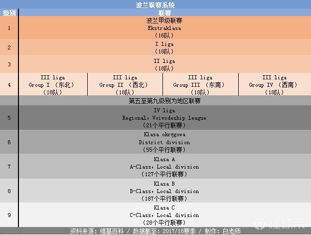 波兰的联赛系统,波兰甲、I liga、II liga及III liga为最高的四个级别,III liga按照地理位置分为四个组。第五至第九级别则为地区联赛,其中第八级别为平行联赛数量最多的一级。