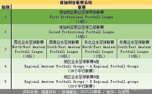 保加利亚联赛系统设有五个级别。从联赛性质来看,前两个级别是职业联赛,后三个级别则是业余联赛。前两级职业联赛都是全国联赛,后三级业余联赛则是地区联赛。第三级别分为四大区域,第四及第五级别就细分为很多平行联赛,不过平行联赛的数量会根据每季各地区参与球队而定。
