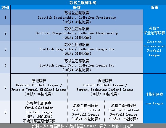 最后来看看第六级别。高地联赛往下是苏格兰北部联赛(North Caledonian Football League),联赛的俱乐部来自苏格兰北部地区及东北方的群岛奥尼克(Orkney)。因为高地本身人口就很少,所以高地联赛加上北部联赛只有27家俱乐部。虽然苏格兰北部联赛处于高地联赛下一级,但是北部联赛是相对独立的联赛,并不会有俱乐部升级至高地联赛,同时高地联赛也不会有俱乐部降级。