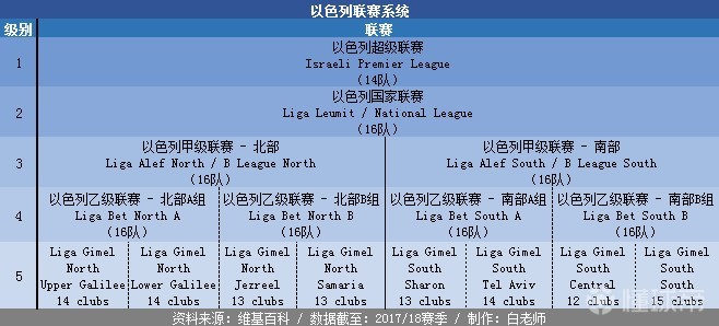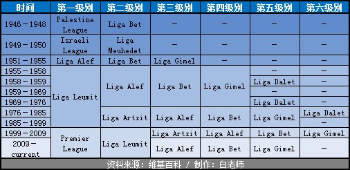 上图是以色列联赛系统的变迁时间表,在1958年就已经发展至五级联赛,并曾在1976年扩充至六级联赛。