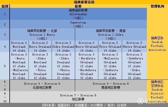 按照各级的联赛数量,瑞典联赛系统的前五个级别可以概括为1-1-2-6-12,这五个级别都归瑞典足协管理。第六至第十级别有相当多的平行联赛,这五个级别则归瑞典地区足球协会管理。而南北的划分,适用于第三至第八级别。