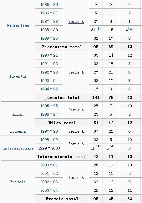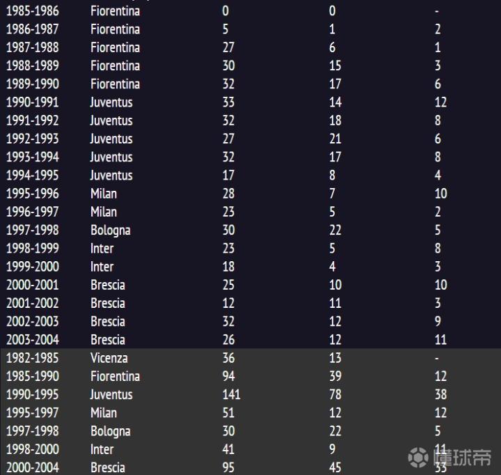 soccer-europe上,进入每个赛季的页面找到巴乔除去了造点的数据(98-00 两个赛季只有助攻数,没有列出是否含有造点数)