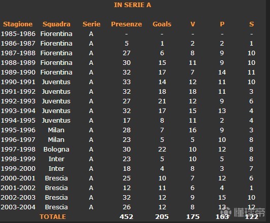 罗伯特-巴乔:205(452场205球0.454效率,意甲205球)