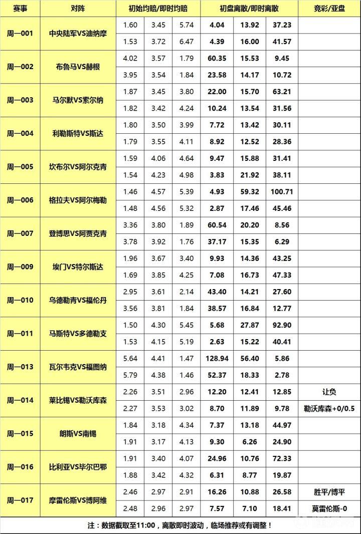 [关于离散] 是竞技彩票特有分析指数,指数基于百家欧赔即时赔率分歧度。基本原理是:百家欧赔平均值与每家赔率差值的绝对值的求和。离散度小则赔率公司观点接近,进而 彩果易打出,离散度大则反之意见分歧大,彩果不易打出。又因庄家操盘/变赔影响,离散低则概率高理论并非放之四海而皆准,需结合盘赔和基本面等信息综合运 用。简言之,离散是参考指标,而非填单依据!以下是各场数据汇总(数据截取至11:00):