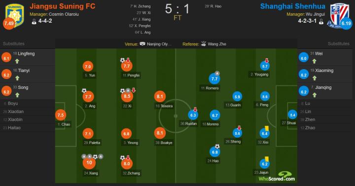 江苏苏宁易购方面,贡献三传一射的吉翔获得满分10分!吴曦8.5分;上海绿地申花方面,罗梅罗得到全队最高的7.7分。