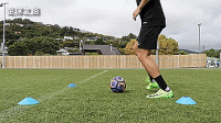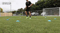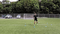 训练时我们先横向高抬腿穿过标志盘,到最后一个标志盘外侧以后,队友传地面或者高空球给你,我们根据变化一脚或者两脚触球传回给他。