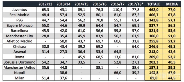 位居次席的则是五年四冠的皇马,皇马六年累计收入是4.067亿欧元,年均也有6780万欧元。此外,巴黎圣日耳曼、拜仁和巴塞罗那则分列三至五位,英超球队中排名最高的则是曼城,排在第六位。