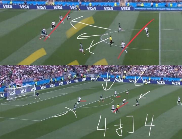墨西哥对阵德国,主动放弃球权,摆出4-2-3-1的主流防守反击阵容,只要通过拼抢夺回球权,就可以马上通过传切,利用拉运、洛纳诺等的速度优势打到德国的中后场。在后半段,墨西哥完全摆大巴,拿出5-4-1的防守阵型,守住胜利果实。