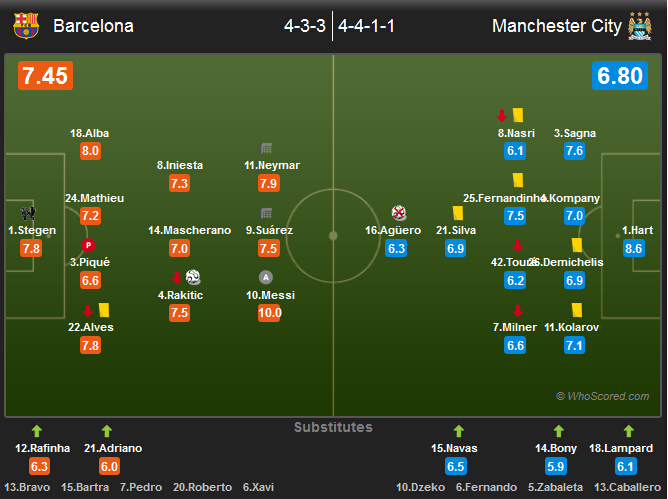 第67分钟,亚亚-图雷禁区外右侧位置的一脚抽射打在右侧边网上。第71分,梅西右路再送斜传,内马尔垫射被门将封堵,随后阿尔巴补射球进,但裁判判罚越位在先,进球无效。第73分钟,博尼接阿圭罗的传球,禁区外的推射高出球门右上角。