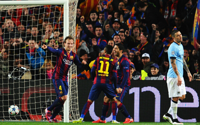 北京时间2015年3月19日凌晨3:45,2014/15赛季欧冠1/8决赛第二回合的一场赛事,由巴塞罗那坐镇主场对战曼城。双方首回合的比赛,巴塞罗那客场2-1胜曼城。本场比赛,梅西助攻拉基蒂奇破门,阿圭罗失点。最终,巴塞罗那主场1-0曼城,总比分3-1淘汰曼城晋级八强。