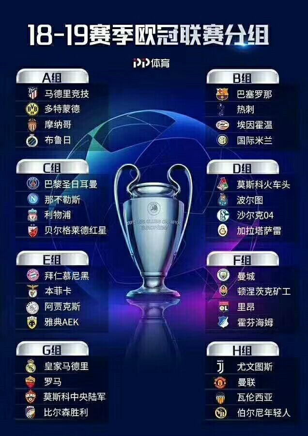 G的球队分别为皇马、罗马、莫斯科中央陆军和比尔森胜利队。罗马狼王托蒂在抽签后表示,罗马队的目标就是争夺小组第二。尽管C罗已经离开,但皇家马德里这五个字仍然令人闻风丧胆。如果罗马队两回合面对中央陆军能拿到4分,出线将毫无悬念。而在H组中,曼联在赛季开始经历了一段时间的低谷,不知欧冠开打后穆里尼奥是否能够将球队重新及时调整到最佳状态。要知道上赛季的欧冠,曼联正是被西甲第四的塞维利亚所淘汰,而今年的西甲第四巴伦西亚也绝不会束手就擒。蝙蝠的攻击群实力强劲,巴舒亚伊、切里舍夫、格德斯、罗德里戈等人会给曼联的后防线造成相当大的威胁。曼联出线的当务之急不是力拼尤文,而是保证两回合对巴伦西亚至少拿4分,以免后院起火。