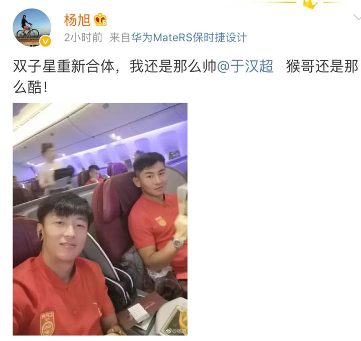 北京时间9月5日凌晨,中国男足国家队飞赴卡塔尔多哈,将在当地时间7日与卡塔尔队进行热身赛。国足队员杨旭在微博晒出了自己和当年辽足队友于汉超在飞机上的合影,并调侃:“双子星重新合体,我还是那么帅,猴哥还是那么酷”。短短20个字,勾起了无数辽足球迷的美好回忆。