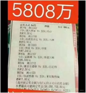 网曝神人880元中竞彩5808万,刷新奖金纪录