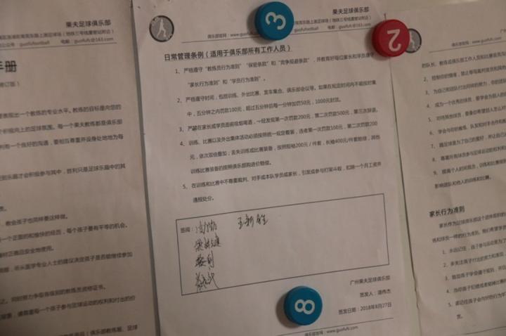 记者在果夫留意到一份“日常管理条例”被贴在办公室显眼处,俱乐部所有教练都在此条例上签名确认,条例上特别对时间遵守作出了严厉规定,“俱乐部要求教练严格遵守时间,包括训练、外出比赛、发车集合、俱乐部会议等,如果在规定时间内不能按时集中,五分钟之内罚款100元,超过五分钟后每一分钟加罚50,1000元封顶。”严厉的管理条例说明俱乐部,“对于任何人来说时间观念都非常重要,足球教练更是如此,迟到不仅影响整个团队,在球场上,射门传球的时机往往就是0.5秒的事,若教练不能以身作则,必定会影响小球员未来成长。”湛教练说道。