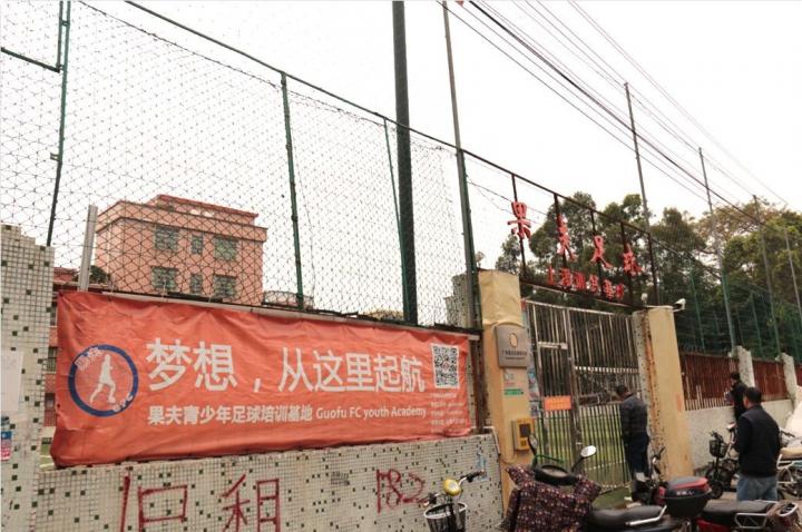 在番禺上漖村,有一块七人制足球场藏于密密麻麻的城中村握手楼之中,球场门口一块橙色的宣传横幅印着“梦想,从这里起航”,而这个承载着许多足球少年梦想的球场就是果夫足球俱乐部的训练基地,“果夫俱乐部的学生大多都住在上漖、大石和洛溪等周边社区,有本村村民也有外地打工人员的孩子。”俱乐部负责人湛伟杰介绍道,“当初选择在这里成立俱乐部的原因很简单,一是球场交通较方便,二是离我家比较近,所以就在上漖村成立了果夫足球。”